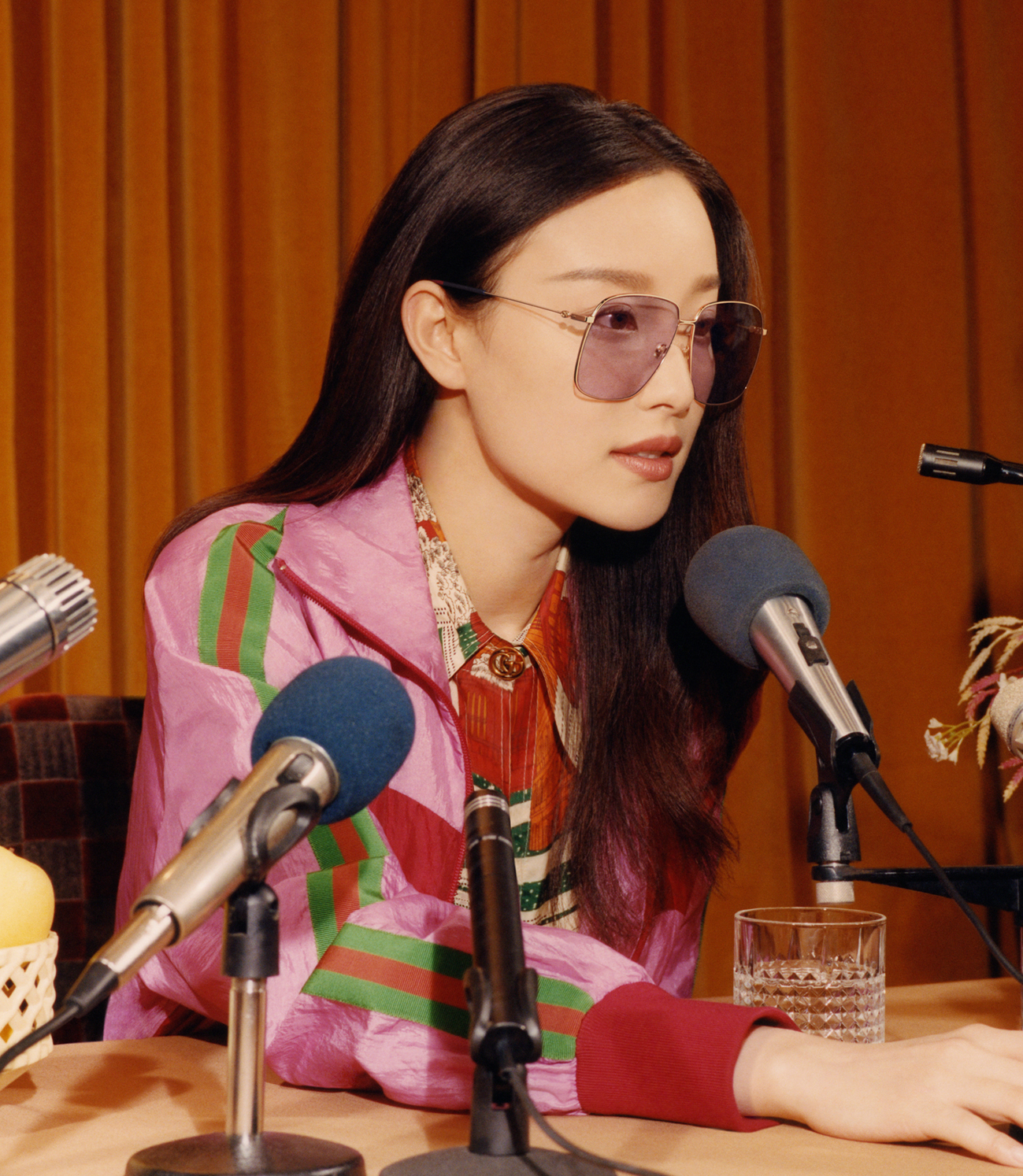 在廣告大片中,倪妮精彩演繹最新眼鏡系列,分別佩戴超大號光學眼鏡和淺粉色太陽鏡,展現別具一格的復古摩登。大黃蜂,雙G標識,經典條紋點綴于鏡片,鉸鏈及鏡腿,設計簡約精致,極具當代風格。