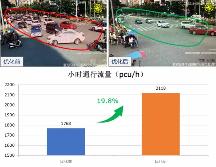 公園路為寶安中心城區主干道,為減少車車交織、改善行車秩序,9月11日,深圳交警將該路口由原先南北早起遲斷、東西對放的相位調整為北、東、南、西順時針輪放的4相位放行模式,優化后,東西、南北行車秩序明顯改善,車車交織現象消失,小時通行流量由1768pcu/h提高至2118pcu/h,提升約19.8%。