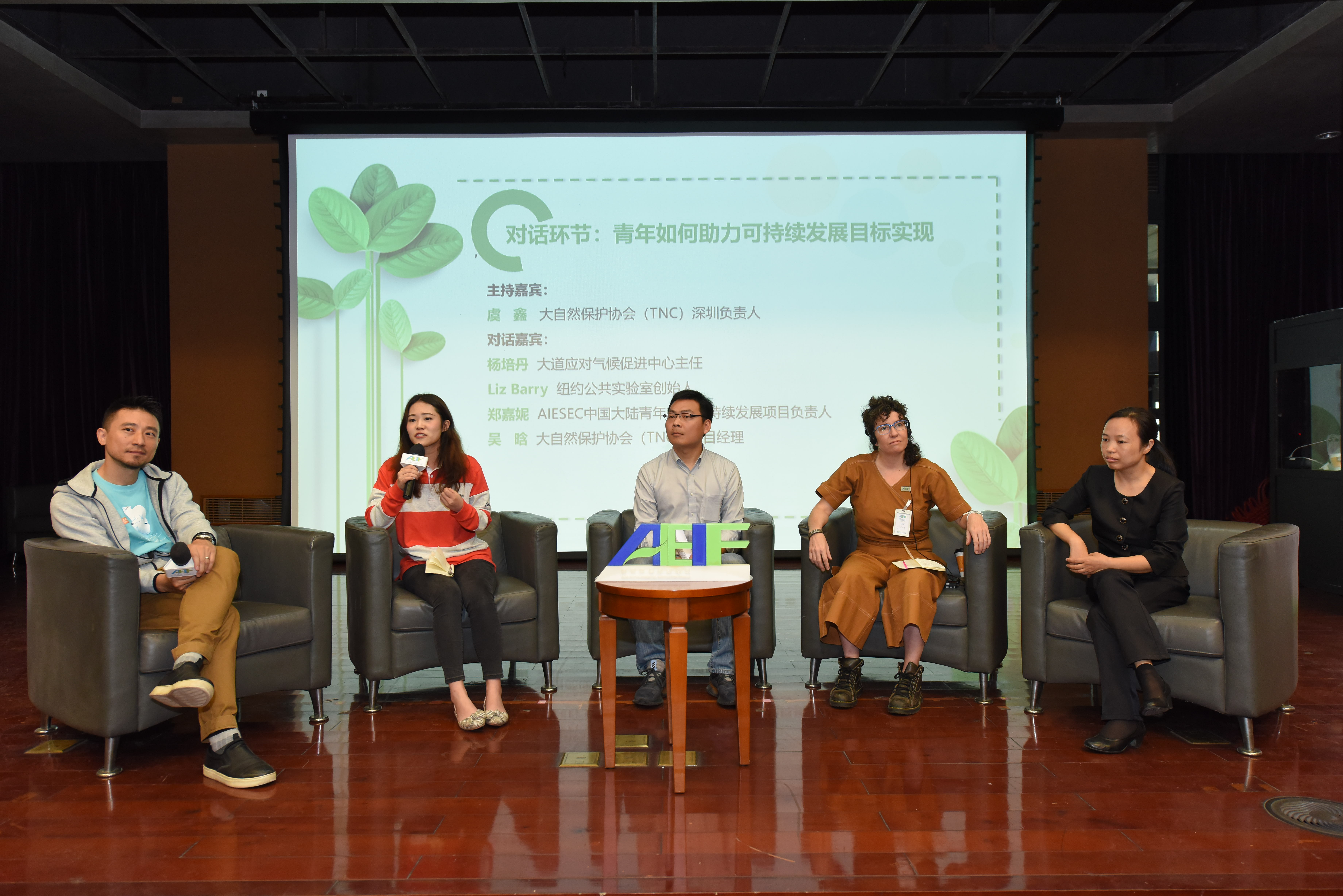 對話環節“青年如何助力可持續發展目標實現”共有6位嘉賓參與。在主持嘉賓大自然保護協會(TNC)深圳保護項目負責人虞鑫先生的帶領下,大道應對氣侯促進中心主任楊培丹、紐約公共實驗室創始人Liz Barry、AIESEC中國大陸青年獻力可持續發展項目負責人鄭嘉妮、大自然保護協會(TNC)項目經理吳晗參與了分享交流。