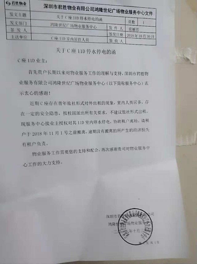 10月30日鴻隆世紀廣場物業服務中心物業發出關于 C座11D停水停電函,表示 C座存在青年旅社形式對外出租的現象,室內人員居多,存在安全隱患,按桂園派出所有關要求,不建議旅社形式出租。業主授權物業中心對11D進行室內停水停電,協助租戶離場,并要求租戶于11月1日之前搬離。