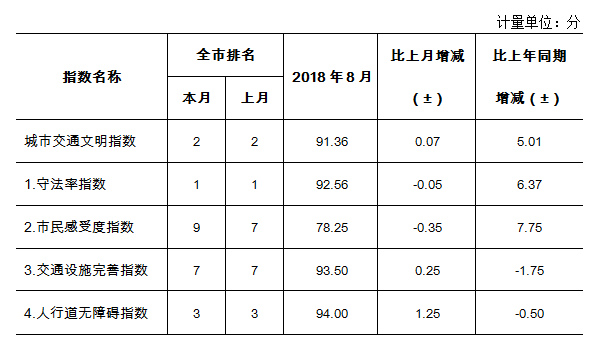 8月份深圳市城市交通文明指數為86.97分。與上月對比,四項分項指數呈“三升一降”現象。