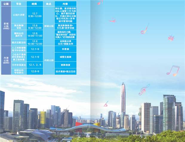 2018深圳公園文化季將延續往屆經典品牌節目,滿足不同受眾的多元需求,推出兒童音樂劇、世界極限運動表演、燃動鵬城2018福田文創音樂周、全國航空模型公開賽、戲曲專場等活動。同時結合各公園特點,打造中心公園風箏表演、翠竹公園首屆竹文化音樂會、皇崗公園非遺主題展、梅林公園社區展演、筆架山公園“深港穗”草地滾球賽等公園特色文化活動。