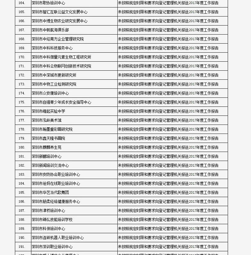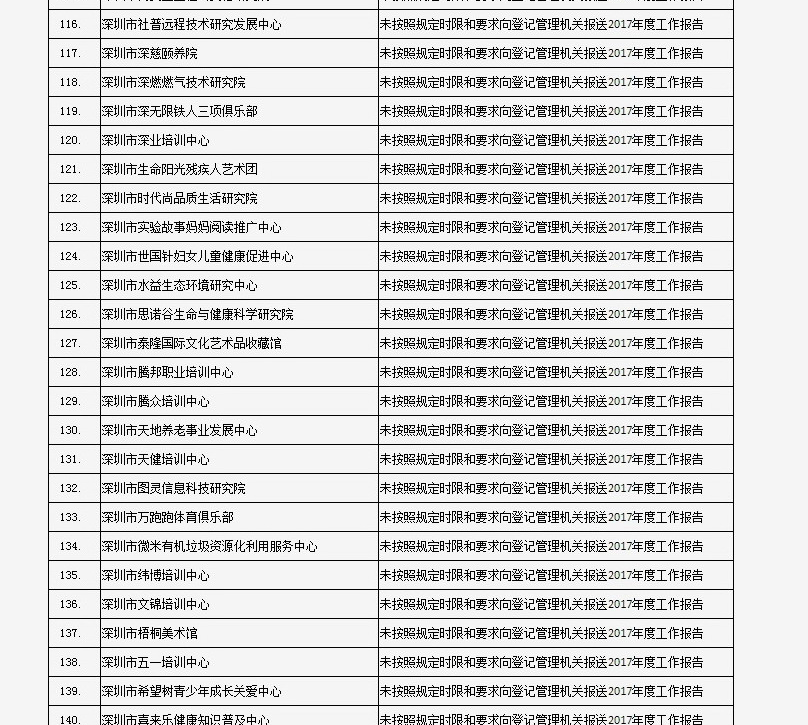 據深圳市民政局通報,深圳市華中科技大學校友會和深圳市深圳大學校友會等121家社會團體、深圳市郴州商會等75家行業協會商會、企業家與企業管理研究院(中國·深圳)等201家民辦非企業單位、深圳市明園慈善基金會等20家基金會,經查“未按照規定時限和要求向登記管理機關報送2017年度工作報告”,違反了《社會組織信用信息管理辦法》《深圳經濟特區行業協會條例》的相關規定,被列入活動異常名錄名單。完整版名單已在“深圳民政在線”公布。