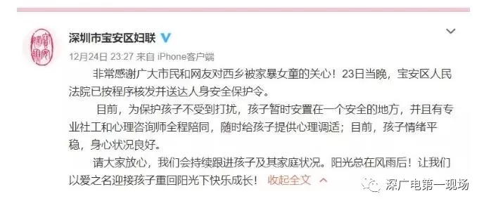 而在稍早前的12月24號,寶安西鄉街道辦發布的情況通報:寶安區人民法院于23號晚已經簽發人身安全保護令,目前已經送達當事人及轄區派出所。