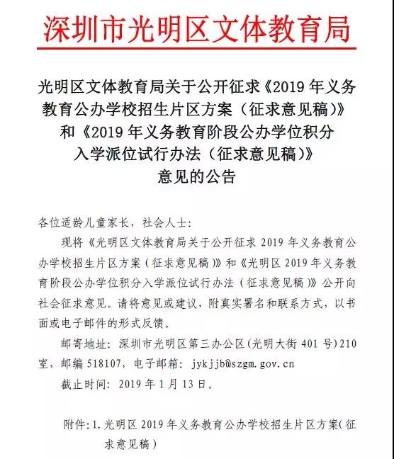 此次征求意見稿截止日期為2019年1月13日,光明區的家長可在截止日前通過“深圳光明教育”公眾號或光明區文體教育局郵箱反饋意見和建議。