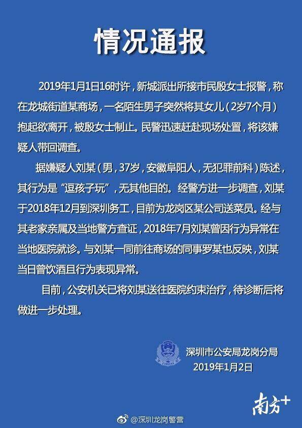 2019年1月2日,深圳市公安局龍崗分局發布情況通報稱:已將劉某送往醫院約束治療,待診斷后將做進一步處理。