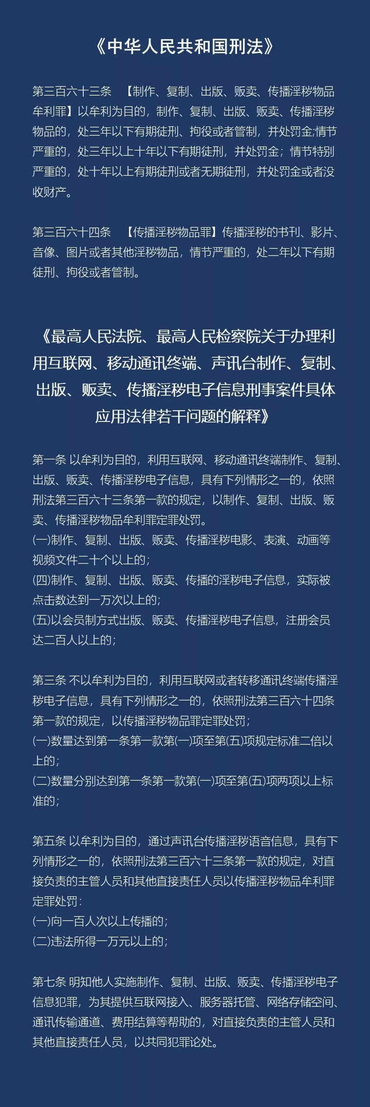 我國《刑法》規定了對傳播淫穢物品牟利罪、傳播淫穢物品罪的處罰,而最高法、最高檢2004年9月出臺的《關于辦理利用互聯網、移動通信終端、聲訊臺制作、復制、出版、販賣、傳播淫穢電子信息的刑事案件具體應用法律若干問題的解釋》,又對此類犯罪認定做了詳細的解釋。