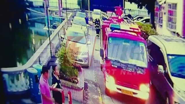 21日晚寶安一小區突然起火,消防人員出動,卻因消防通道停滿車 使消防車被堵火場外