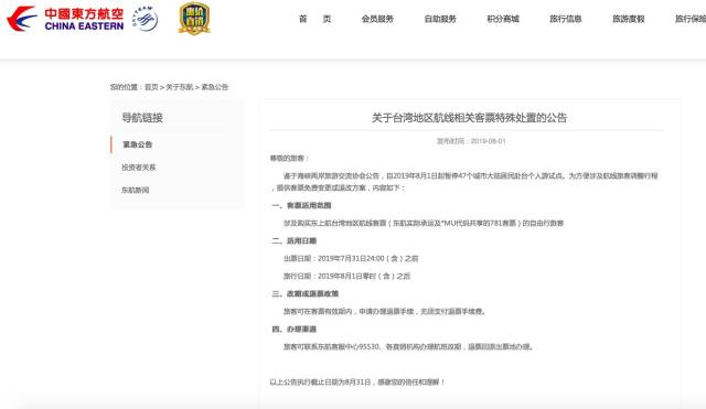 繼深航之后,東航也剛剛發布了關于臺灣地區航線相關客票特殊處置的公告:涉及購買東航臺灣地區航線客票(東航實際承運及*MU代碼共享的781客票)的自由行旅客,出票日期在2019年7月31日24:00(含)之前,旅行日期在2019年8月1日零時(含)之后的,旅客可在客票有效期內,申請辦理退票手續,無須支付退票手續費。