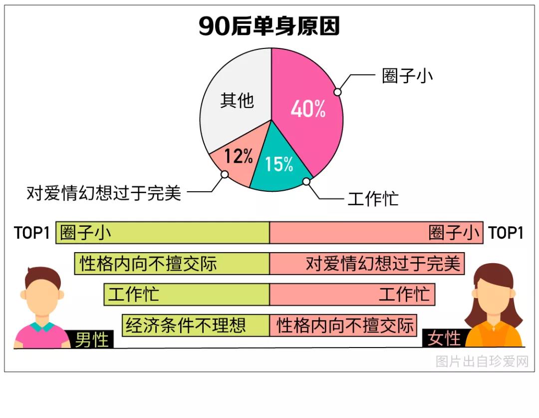 調查結果發現,圈子小(40%)、工作忙(15%)、對愛情幻想過于完美(12%)為90后單身的主要原因。就性別差異而言,除了圈子小之外,男性單身的主要原因是性格內向不擅交際(33.53%)、工作忙(32.07%)以及經濟條件不理想(19.02%)。女性單身的主要原因則是對愛情幻想過于完美(29.67%)、工作忙(28.04%)及性格內向不擅交際(14.82%)。從學歷背景看,學歷越高越容易受困于生活圈子小和工作忙帶來的擇偶問題,而且博士人群對愛情幻想過于完美的比例比其他學歷的人群更高。