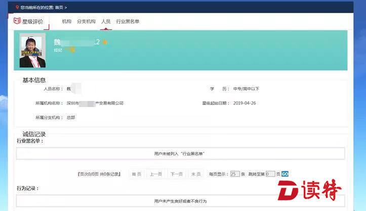 模塊中涉及到中介機構和中介人員的星級評價,來自深圳市房地產中介協會(以下簡稱“深房中協”)與各大中介機構組成的專家委員的定期聯合評定。無論是中介人員還是中介機構,都需從一星經數次評選提升至五星等級,越高星級的人員與機構,意味著更少的投訴信息與更加優良的誠信記錄。目前上線的模塊中,僅有大約10%的中介人員獲得了五星認定。