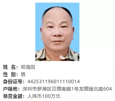汕尾市公安局于11月11日發布的通告中,共有3人被懸賞通緝,分別是鄭海田(金額100萬)、唐偉杰(金額100萬)、洪水生(金額50萬)。