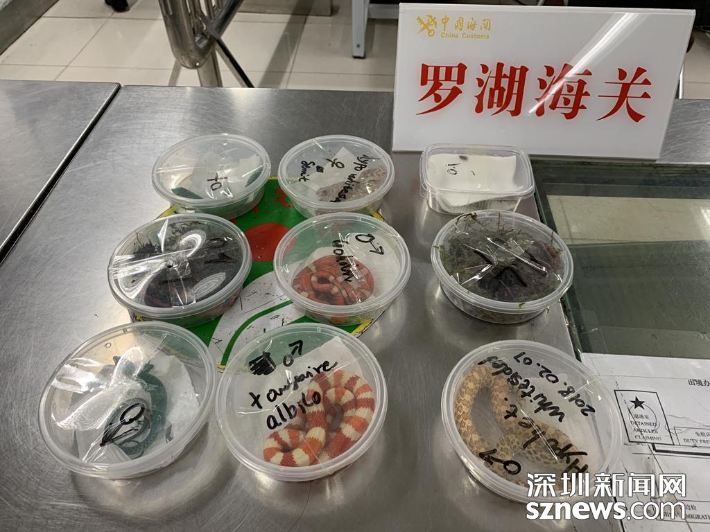 4月19日,一名旅客攜帶洪都拉斯奶蛇、龍紋翡翠蜥蜴等多個品種合計9只爬行綱動物自羅湖口岸入境,被深圳海關隸屬羅湖海關當場查獲。