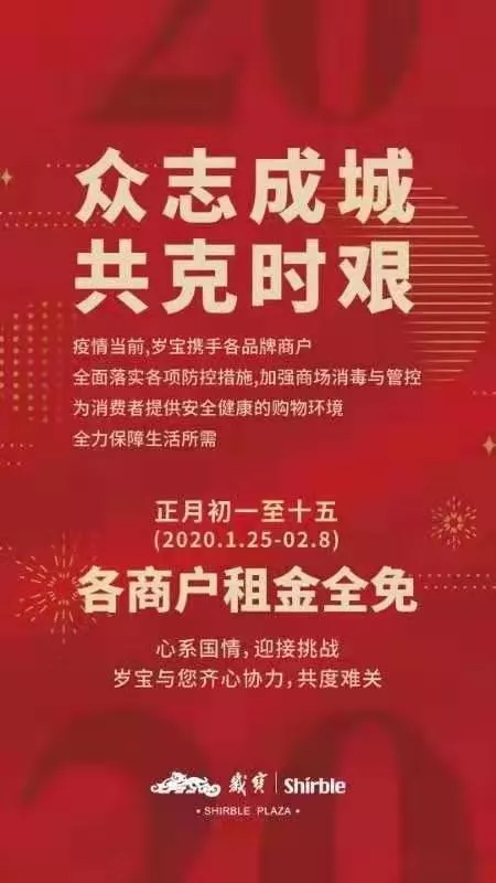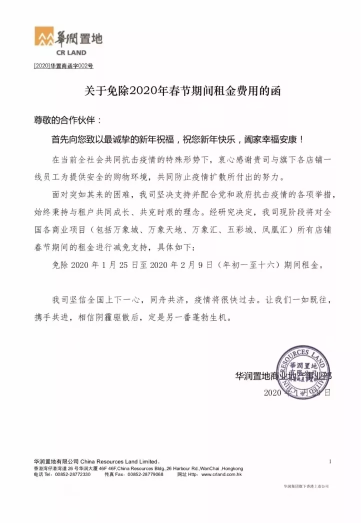 華潤置地宣布免收1月25日—2月9日全國所有商業項目的租金,與商戶攜手共進。