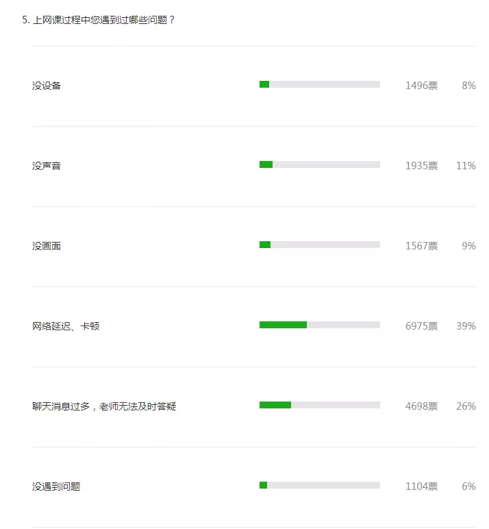 此外,22%的參與者認(rèn)為,網(wǎng)課缺乏教學(xué)氛圍,無(wú)法真正實(shí)現(xiàn)互動(dòng)式在線課堂。有家長(zhǎng)認(rèn)為,目前老師用群進(jìn)行講解,聊天消息過(guò)多,信息雜亂,老師無(wú)法及時(shí)答疑,建議老師通過(guò)小視頻等形式將熱點(diǎn)問(wèn)題再進(jìn)行補(bǔ)充講解。