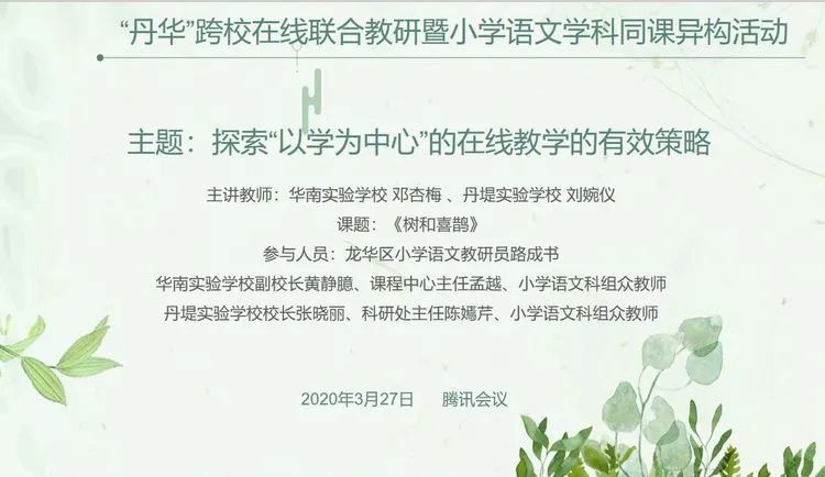 見圳客戶端、深圳新聞網2020年3月31日訊 (記者 潘寶儀)丹堤實驗學校與華南實驗學校異苔同岑,相聚“丹華”,以鄧杏梅老師與劉婉儀老師關于《樹和喜鵲》的同課異構為課例,開展了丹華跨校“以學為中心”的小學語文在線教學策略研討會。