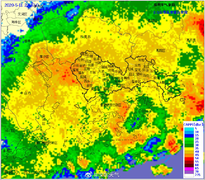 21時49分:目前強雷雨云團已給寶安、光明、龍華、南山、福田等區域帶來強雷雨和大風,預計即將影響羅湖、鹽田、龍崗、坪山和大鵬,將帶來小時雨量30毫米左右的降雨以及8-9級的短時大風,請注意防御。