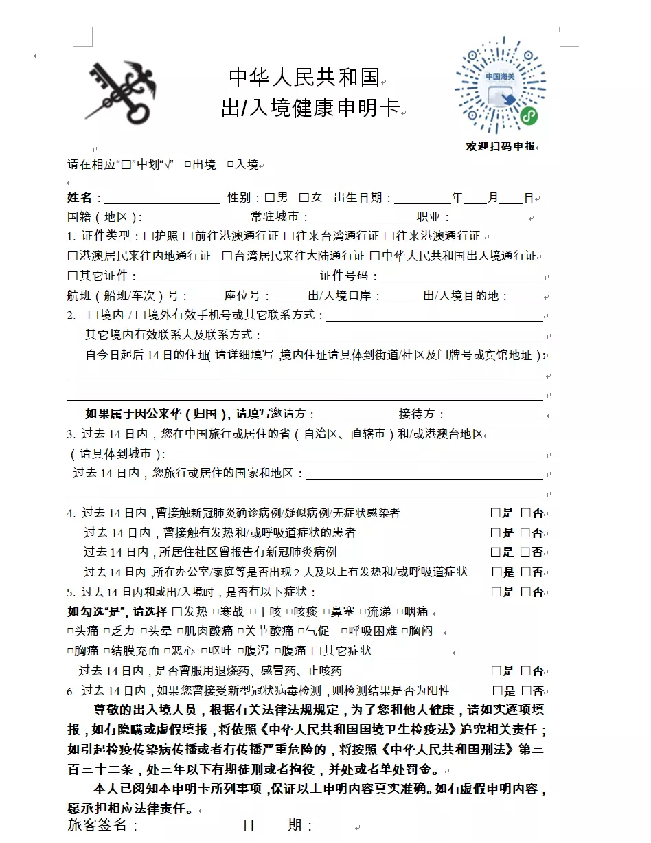 一、請提前下載打印《健康申明卡》(見附件1),或關注“海關旅客指尖服務小程序”(見附件2)。提前如實填寫紙質或電子健康申報信息,通關時主動向海關申報。