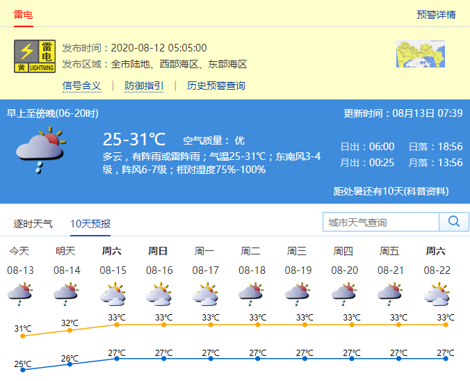 見圳客戶端·深圳新聞網2020年8月13日訊 據市氣象臺消息,13日全天,我市多云,有陣雨或雷陣雨;氣溫25-31℃;東南風3-4級,陣風6-7級;相對濕度75%-100%。