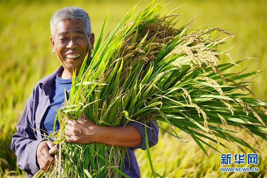 9月23日,河北省灤縣茨榆坨鎮西長坨村農民金玉柱在收獲稻米。