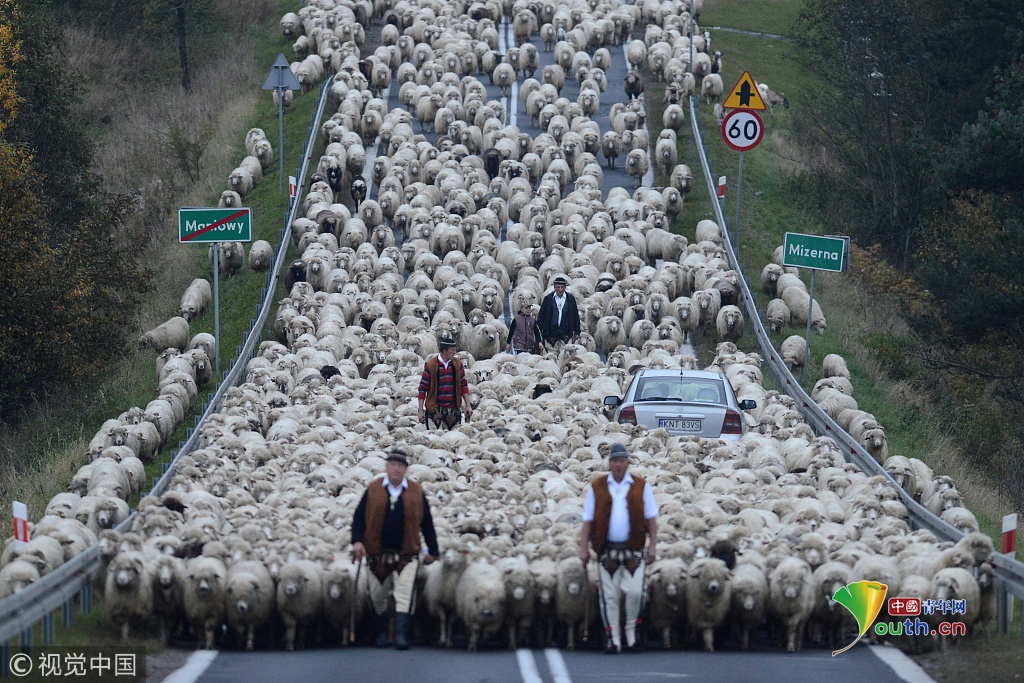 2018年9月27日訊(具體拍攝時間不詳),波蘭,浩浩蕩蕩的綿羊大軍為了趕在冬天之前回到農場過冬,阻斷了鄉村的主車道。