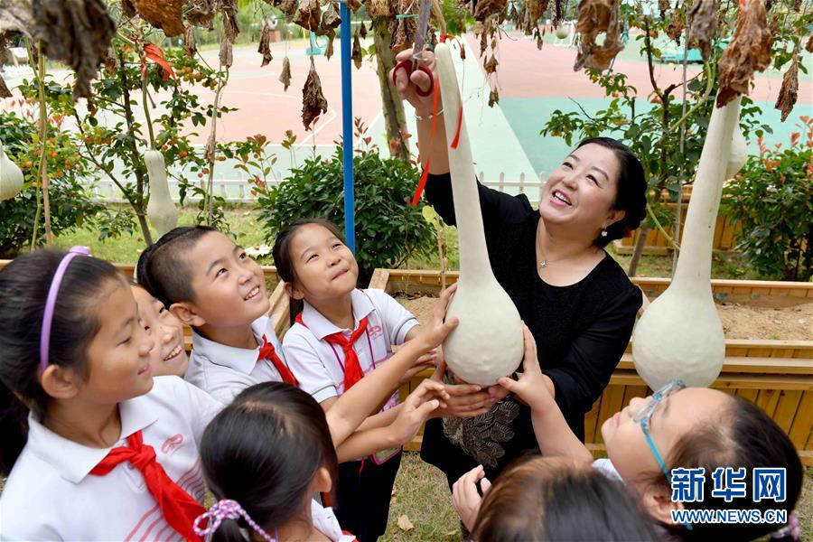 9月29日,在威海市經濟技術開發區新都小學,老師帶著學生采摘葫蘆。