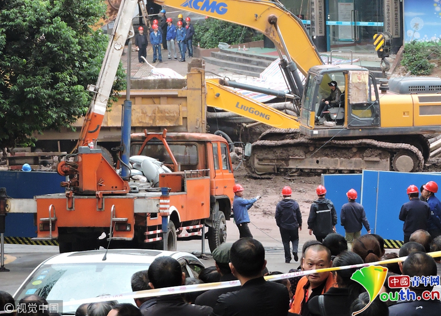 中國青年網(wǎng)北京10月9日電 2018年10月8日消息,四川達州。10月8日從四川省達州市達川區(qū)委宣傳部獲悉,7日14時30分左右,達川區(qū)東環(huán)南路103號人行道路面發(fā)生塌陷險情,經(jīng)調(diào)取視頻監(jiān)控和走訪周邊群眾,救援人員初步判斷疑似有4人掉入坑中。圖片作者:視覺中國