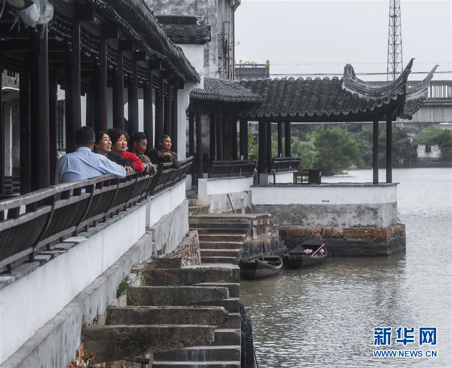 10月10日,泉家潭村村民劃著小船經過沿河長廊(無人機拍攝)。經過改造提升后,沿河長廊和整潔的古村街巷成為當地美麗鄉村的景觀帶。 新華社記者 徐昱