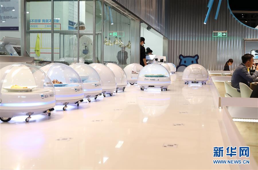 近日,一家由機器人充當送餐服務員的盒馬機器人餐廳現身上海國家會展中心,為顧客帶來一種用餐新選擇。