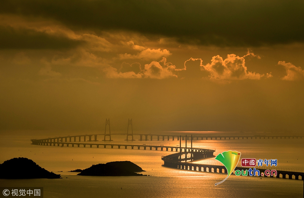2018年5月21日,廣東珠海,太陽(yáng)從香港大嶼山慢慢升起,港珠澳大橋猶如一條巨龍蜿蜒盤繞在海面上。