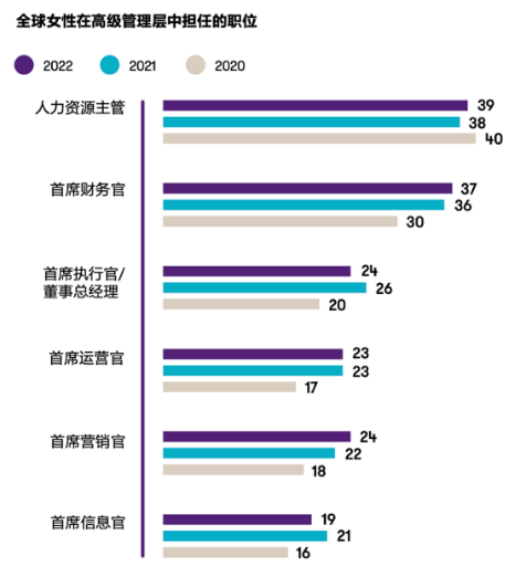 調查顯示,在全球女性擔任的高級管理職務中,人力資源主管仍然是占比最高的職位,達到39%。可喜的是,2021年,女性擔任與戰略運營相關的高級管理層職位比例有所上升,今年這一趨勢持續。2022年,女性擔任首席財務官的比例上升至37%,擔任首席營銷官的比例則連續兩年上升,達到24%。同時,隨著管理層職位的性質發生變化,人力資源主管這一職位也將變成更具戰略意義。