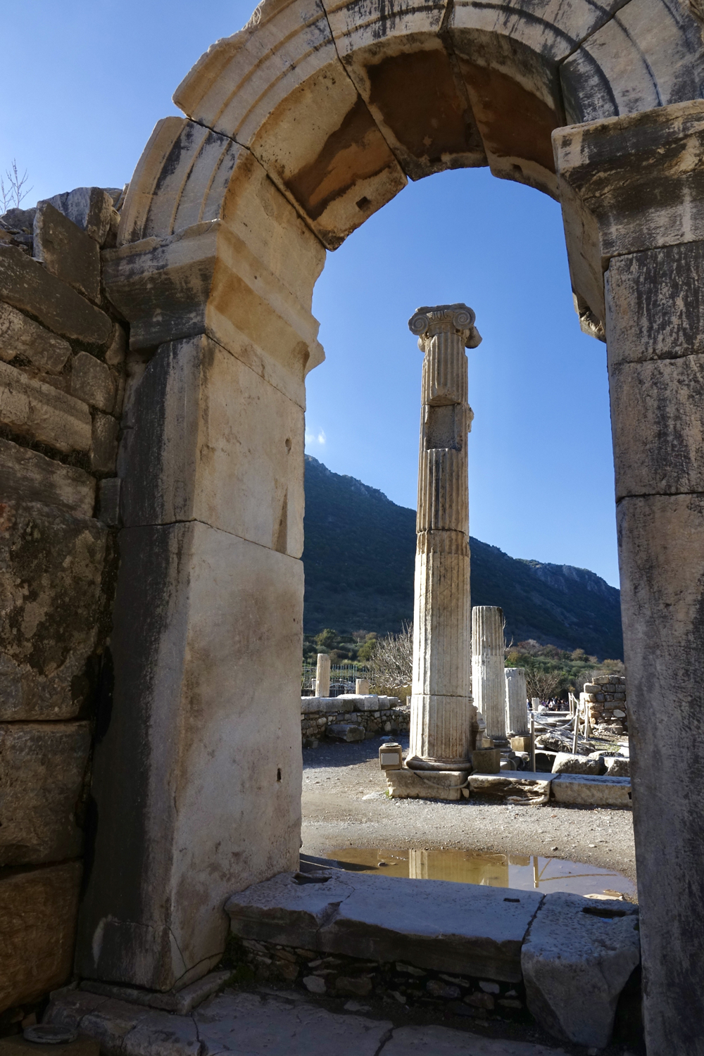 立柱背后是市政廳遺址。經過幾百年的地貌變遷,以弗所的入??跐u漸被淤泥填塞,它賴以生存的海洋貿易遂告終結,加上地中海沿岸頻發的地震,以弗所難逃被遺棄的噩運,這座新約《圣經》中出現過的城市,最終淪為一片大理石廢墟。李仁奇 攝