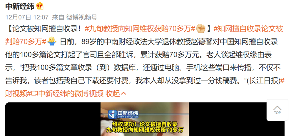 中南財經政法大學退休教授蘇少之,趙德鑫教授的學生,后來以同樣的方式打官司并勝訴。維權成功后,蘇少之的論文也被中國知網下架了。有網友點評一針見血:中國知網是不是該把所有教授的賬都結一下?