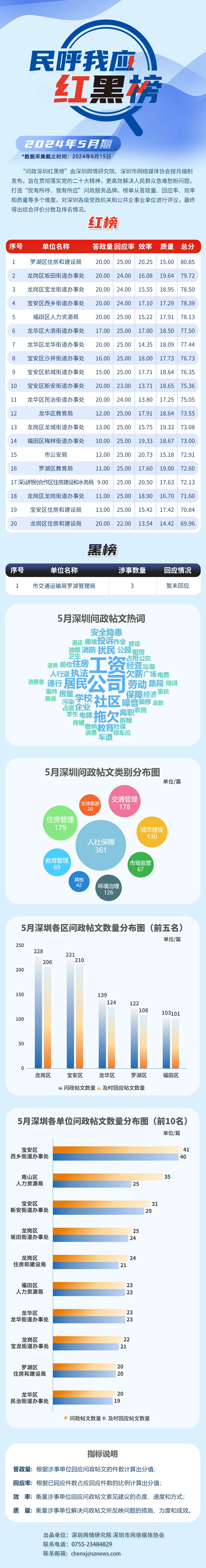 本期榜單采集的帖文主要來自深圳市及各區政府官網、深圳論壇、人民網領導留言板、深圳新聞網“民呼我應”等平臺,所采集帖文發布時間為2024年5月1日至5月31日,采集截止時間為2024年6月15日。