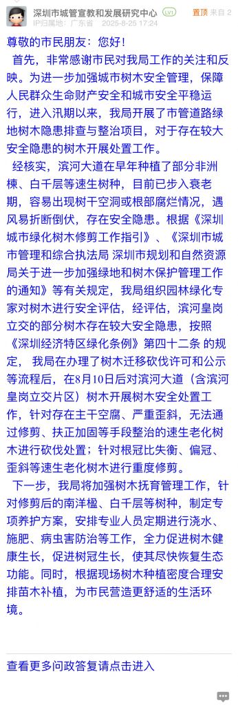 經核實,濱河大道在早年種植了部分非洲楝、白千層等速生樹種,目前已步入衰老期,容易出現樹干空洞或根部腐爛情況,遇風易折斷倒伏,存在安全隱患。根據《深圳城市綠化樹木修剪工作指引》、《深圳市城市管理和綜合執法局 深圳市規劃和自然資源局關于進一步加強綠地和樹木保護管理工作的通知》等有關規定,我局組織園林綠化專家對樹木進行安全評估,經評估,濱河皇崗立交的部分樹木存在較大安全隱患,按照《深圳經濟特區綠化條例》第四十二條 的規定, 我局在辦理了樹木遷移砍伐許可和公示等流程后,在8月10日后對濱河大道(含濱河皇崗立交片區)樹木開展樹木安全處置工作,針對存在主干空腐、嚴重歪斜,無法通過修剪、扶正加固等手段整治的速生老化樹木進行砍伐處置;針對根冠比失衡、偏冠、歪斜等速生老化樹木進行重度修剪。