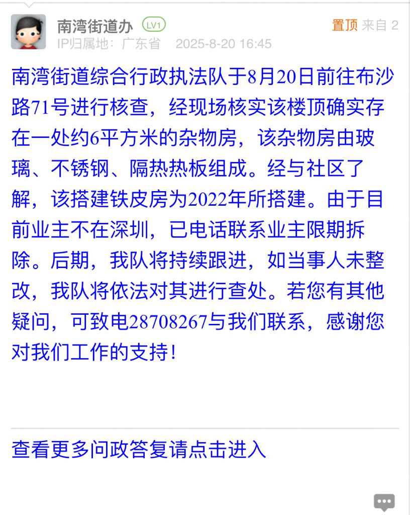 南灣街道綜合行政執法隊于8月20日前往布沙路71號進行核查,經現場核實該樓頂確實存在一處約6平方米的雜物房,該雜物房由玻璃、不銹鋼、隔熱熱板組成。經與社區了解,該搭建鐵皮房為2022年所搭建。由于目前業主不在深圳,已電話聯系業主限期拆除。后期,我隊將持續跟進,如當事人未整改,我隊將依法對其進行查處。若您有其他疑問,可致電28708267與我們聯系,感謝您對我們工作的支持!