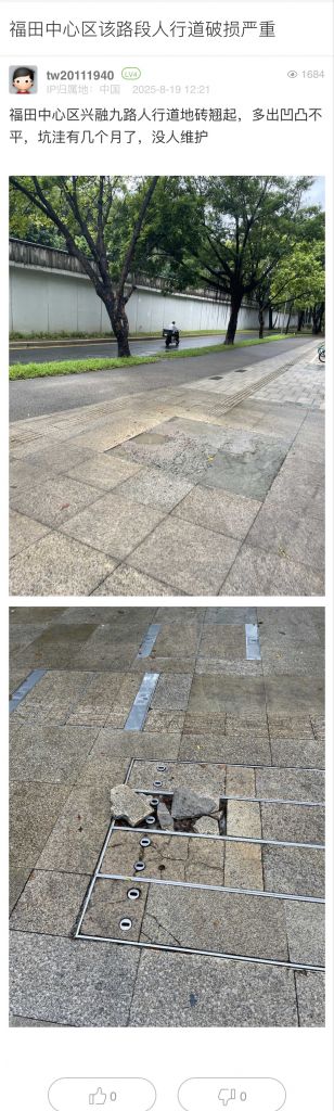 8. 帖文《福田中心區該路段人行道破損嚴重》