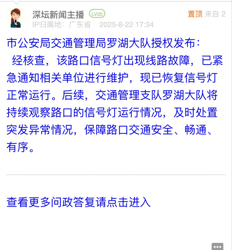 經核查,該路口信號燈出現線路故障,已緊急通知相關單位進行維護,現已恢復信號燈正常運行。后續,交通管理支隊羅湖大隊將持續觀察路口的信號燈運行情況,及時處置突發異常情況,保障路口交通安全、暢通、有序。
