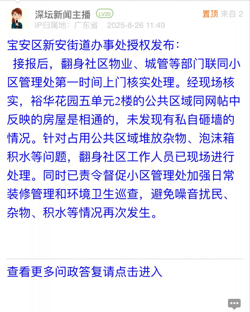 接報后,翻身社區物業、城管等部門聯同小區管理處第一時間上門核實處理。經現場核實,裕華花園五單元2樓的公共區域同網帖中反映的房屋是相通的,未發現有私自砸墻的情況。針對占用公共區域堆放雜物、泡沫箱積水等問題,翻身社區工作人員已現場進行處理。同時已責令督促小區管理處加強日常裝修管理和環境衛生巡查,避免噪音擾民、雜物、積水等情況再次發生。