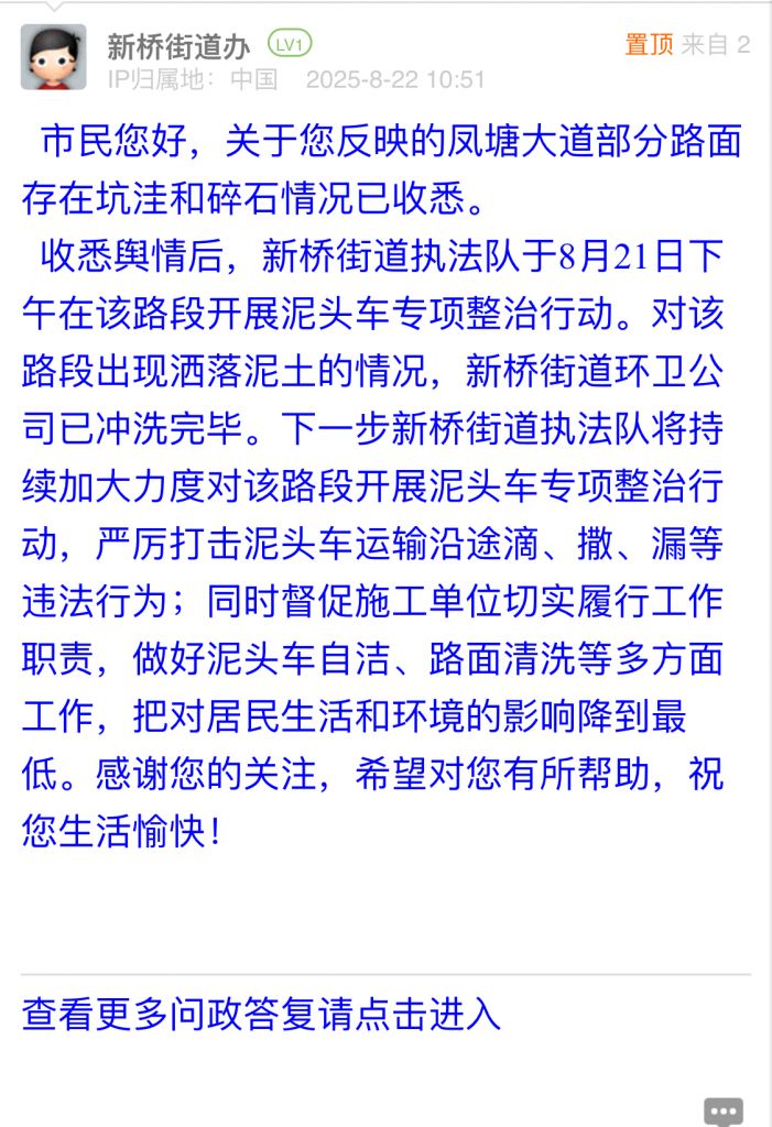 收悉輿情后,新橋街道執法隊于8月21日下午在該路段開展泥頭車專項整治行動。對該路段出現灑落泥土的情況,新橋街道環衛公司已沖洗完畢。下一步新橋街道執法隊將持續加大力度對該路段開展泥頭車專項整治行動,嚴厲打擊泥頭車運輸沿途滴、撒、漏等違法行為;同時督促施工單位切實履行工作職責,做好泥頭車自潔、路面清洗等多方面工作,把對居民生活和環境的影響降到最低。感謝您的關注,希望對您有所幫助,祝您生活愉快!