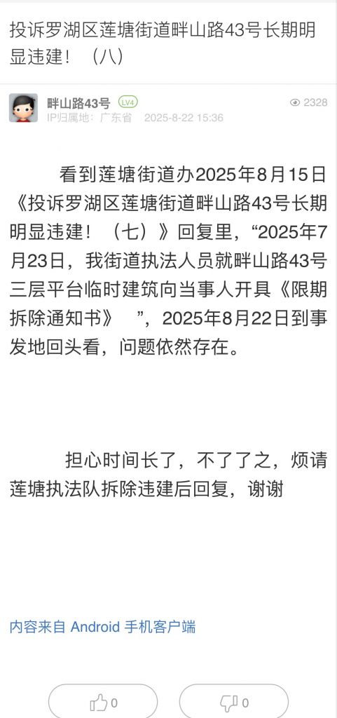 30. 帖文《投訴羅湖區蓮塘街道畔山路43號長期明顯違建!(八)》
