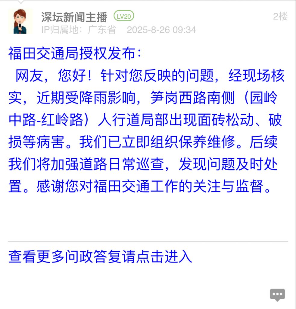 網友,您好!針對您反映的問題,經現場核實,近期受降雨影響,筍崗西路南側(園嶺中路-紅嶺路)人行道局部出現面磚松動、破損等病害。我們已立即組織保養維修。后續我們將加強道路日常巡查,發現問題及時處置。感謝您對福田交通工作的關注與監督。