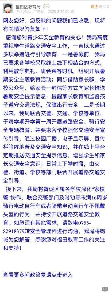 接下來,我局將督促區屬各學校深化“家校警”協作,聯合交警部門及時勸導未滿16周歲騎行電動自行車或者騎乘電動自行車不佩戴頭盔的行為,并持續開展道路交通安全教育。如您還有其他需求,請致電0755-82918379轉安全管理科進行溝通,我局將竭誠為您解答,感謝您對福田教育工作的關注和支持!