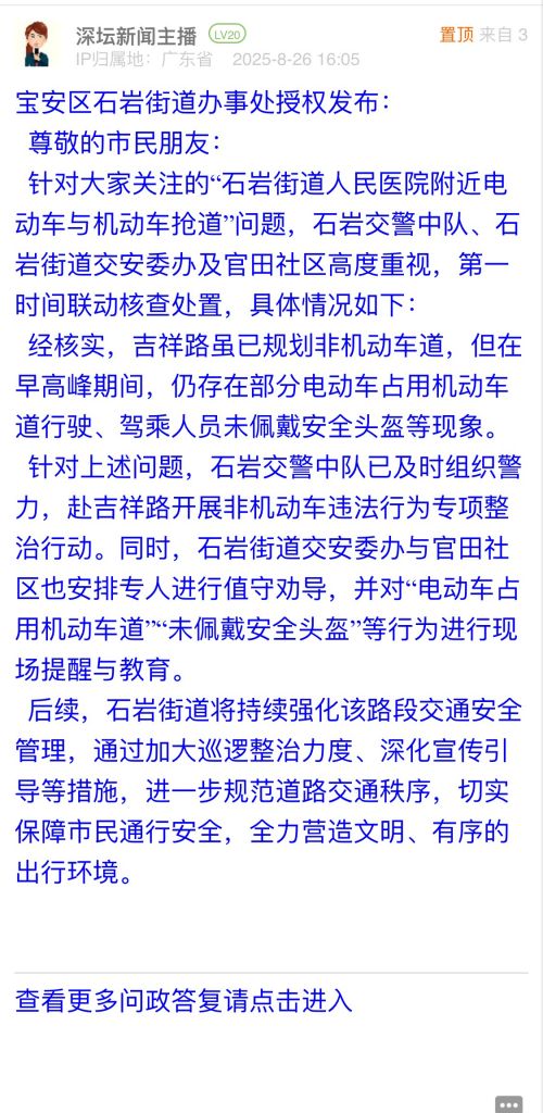 針對大家關注的“石巖街道人民醫院附近電動車與機動車搶道”問題,石巖交警中隊、石巖街道交安委辦及官田社區高度重視,第一時間聯動核查處置,具體情況如下: