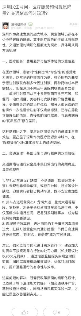15. 帖文《深圳民生兩問:醫療服務如何提質降費?交通堵點何時疏通?》