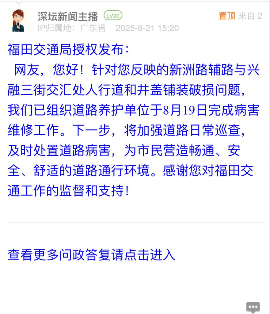 網友,您好!針對您反映的新洲路輔路與興融三街交匯處人行道和井蓋鋪裝破損問題,我們已組織道路養護單位于8月19日完成病害維修工作。下一步,將加強道路日常巡查,及時處置道路病害,為市民營造暢通、安全、舒適的道路通行環境。感謝您對福田交通工作的監督和支持!