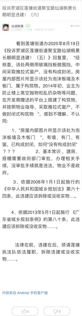 3. 帖文《投訴羅湖區蓮塘街道聚寶路仙湖楓景長期明顯違建!(五)》