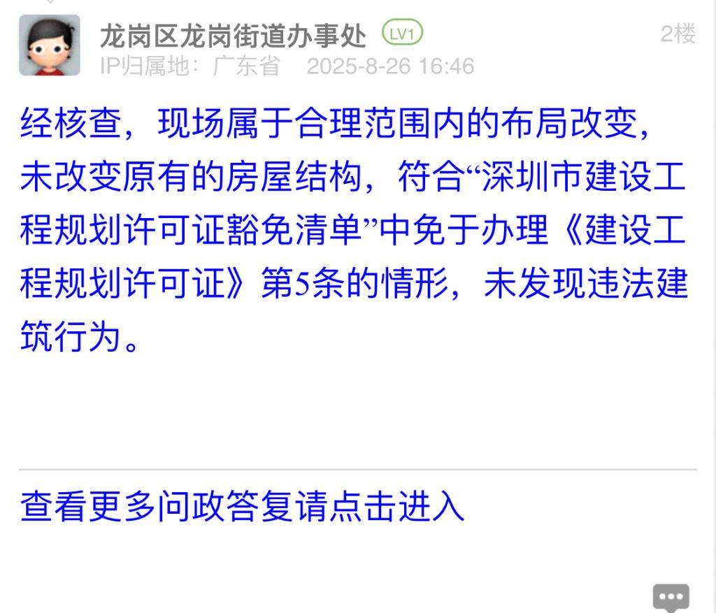 經核查,現場屬于合理范圍內的布局改變,未改變原有的房屋結構,符合“深圳市建設工程規劃許可證豁免清單”中免于辦理《建設工程規劃許可證》第5條的情形,未發現違法建筑行為。