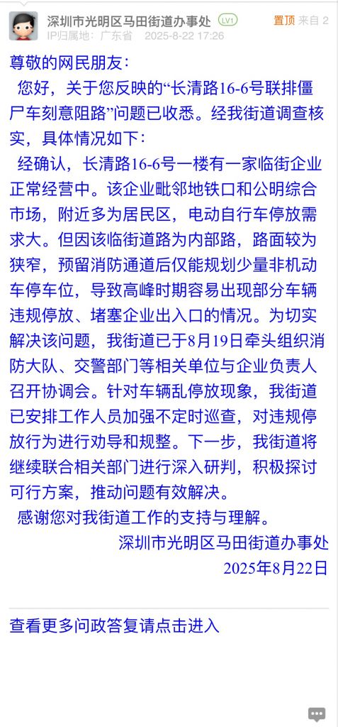 經確認,長清路16-6號一樓有一家臨街企業正常經營中。該企業毗鄰地鐵口和公明綜合市場,附近多為居民區,電動自行車停放需求大。但因該臨街道路為內部路,路面較為狹窄,預留消防通道后僅能規劃少量非機動車停車位,導致高峰時期容易出現部分車輛違規停放、堵塞企業出入口的情況。為切實解決該問題,我街道已于8月19日牽頭組織消防大隊、交警部門等相關單位與企業負責人召開協調會。針對車輛亂停放現象,我街道已安排工作人員加強不定時巡查,對違規停放行為進行勸導和規整。下一步,我街道將繼續聯合相關部門進行深入研判,積極探討可行方案,推動問題有效解決。