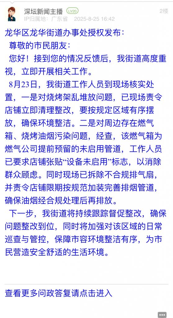 1. 帖文《翠竹街道燒烤店占道經營,沒人處理》